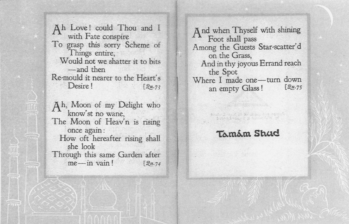 Below is the 'Tamam Shud' page from our 1942 or JW version. Notice the artwork on the surround of the page. Also, notice again the colour of the page and the location of that crescent moon to the upper right of the page.