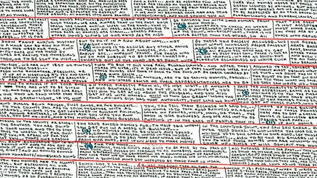 This is an example of a 'Kite' it's the form of secret microwriting used by US gangs to communicate from prisons to the outside world and back. There are many of these examples in existence; here are two. The 'Kites' are in many cases rules of behaviour whilst in others they contain instructions for a 'hit' to be carried out. Two examples are shown here.